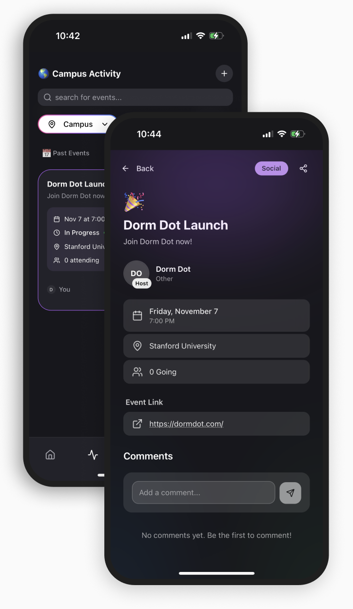 The Activity page on Dorm Dot acts as a hub for what’s happening around campus — from spontaneous hangouts to casual study sessions or dorm events. Students can post short updates or “events” that describe what they’re doing or planning, giving others the chance to join in if the vibe matches their own. Whether it’s “open door movie night in Wilbur” or “late-night study in FloMo lounge,” the goal is to make it easy for moments of connection to form naturally.